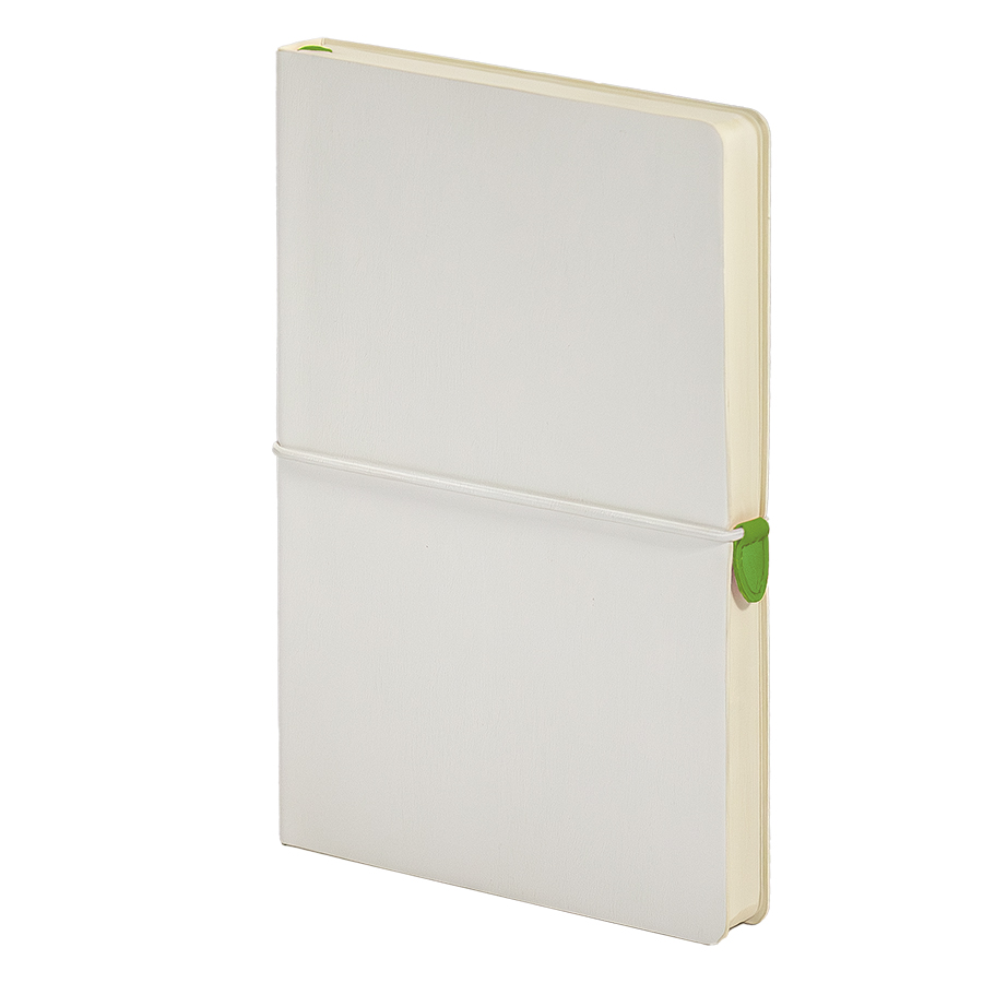 Яркий и оригинальный блокнот для молодой деловой аудитории. Горизонтальная резинка и зигзагообразная строчка на корешке. Удобный клип для открывания. Обложка из PU Shevret скомбинирована из 2-х цветов. Белая лицевая сторона обложки подходит для УФ-печати, шелкографии, тиснения фольгой и блинтом. Цвет задней стороны обложки близок к Pantone 369C.