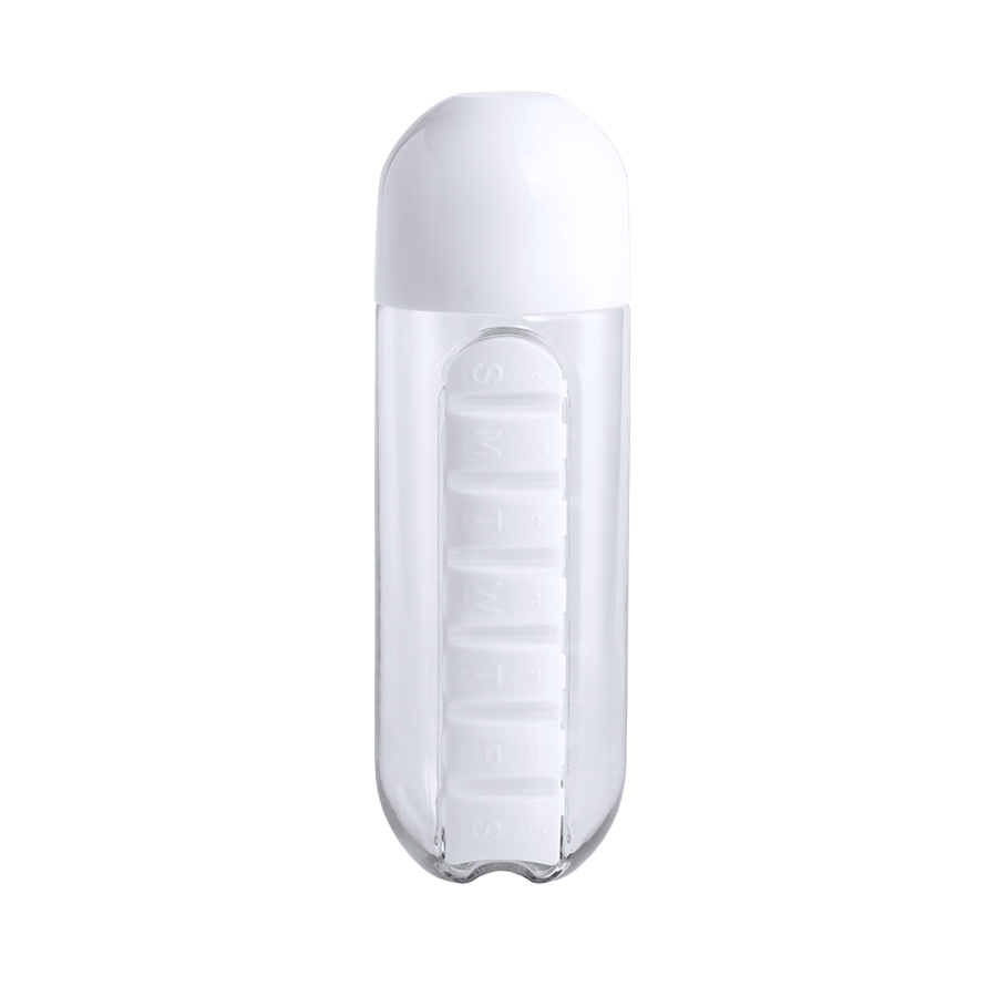 Пластиковая бутылка для воды, выполнена в форме капсулы, с контейнером для таблеток и витаминов, который поделен на 7 секторов по дням недели. Все 7 контейнеров помечены шрифтом Брайля, для людей имеющих проблемы со зрением. Контейнер для витаминов и таблеток съемный, при необходиомсти им можно пользоваться отдельно от бутылки. Очень удобно иметь все под рукой — таблетницу с указанием дней недели и бутылку с водой. BPA-free (не содержит бисфенол-А). Упаковка — индвидуальный ПЭ пакет