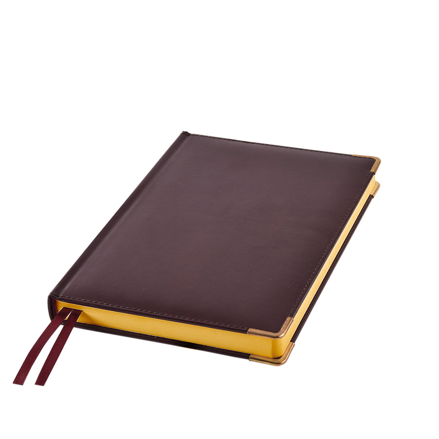 Цвет обложки, близкий к пантону 4975C Размер 147*215 мм, переплет твердый Обложка рециклированная кожа Cromwell Блок полудатированный, в линейку Скругленные углы Золотой обрез Металлические позолоченные уголки Бумага кремовая, плотность 70г м2 Форзац нахзац кремовые 400 страниц Двойное ляссе в цвет обложкиПодарочная коробка