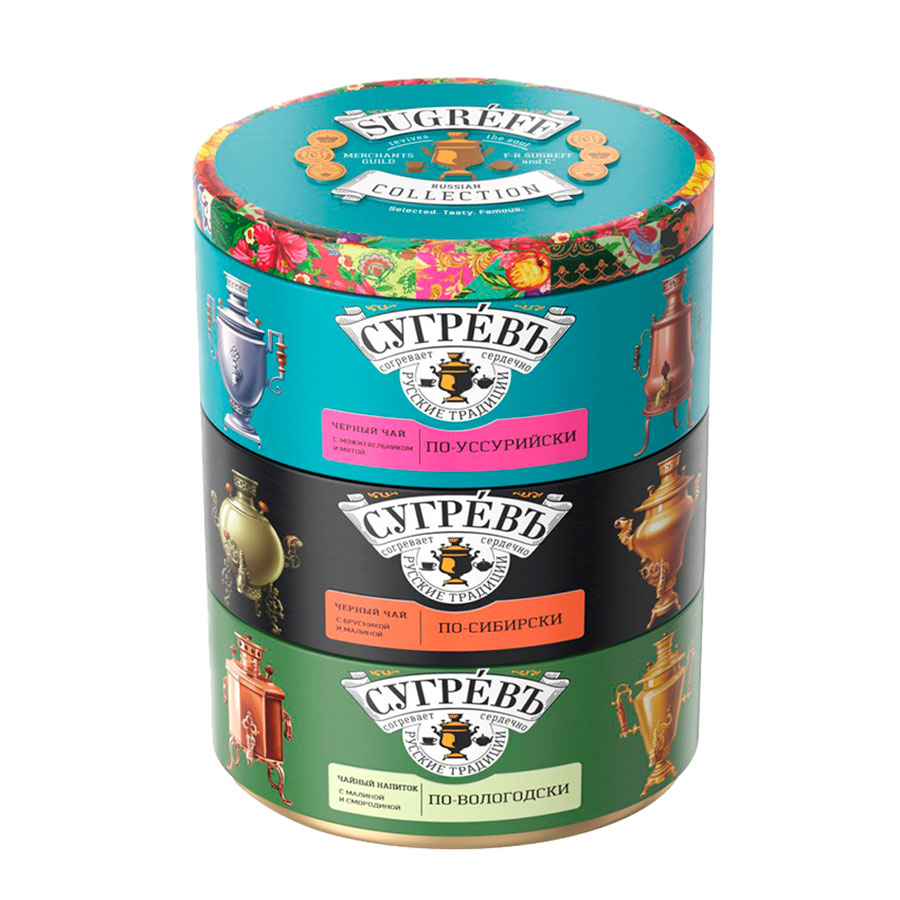 Подарочный набор СУГРЕВЪ «Россия» с чаем и леденцами Подарочный набор из 3 эксклюзивных купажей листового чая, трав и ягод, характерных для разных регионов России, в жестяной банке. В крышке верхней баночки находятся вкусные и эффектные леденцы в форме малинки. Все купажи 100 % натуральные. Причины купить набор: Набор интересен компаниям банкам государственным структурам, имеющим сеть филиалов региональных офисов дистрибьюторов, поскольку является «метафорой» всей России (чай по-карельски, по-уссурийски, по-вологодски). Он подчёркивает российское происхождение компании, верность традициям и приверженность натуральности. Достойный подарок для друзей, коллег, партнёров; оригинальный сувенир из России для иностранцев; небанальный подарок руководителю; презент для учителей, врачей и т.д.; вкусный чай для личного потребления. Возможная кастомизация: Стикер на фронтальной стороне баночки, а также стикер, соединяющий крышку с верхней банкой, может кастомизироваться под заказчика. Например, на чае может быть написано не «По-уссурийски», а «По-хабаровски» и т. п. Также вместо конфет в крышечку-тайник верхней банки можно положить поздравительную мини-открытку, брелок, флешку или иной небольшой сувенир. Размер набора (мм): 150 х 100 х 70 Вес набора брутто: 315 г