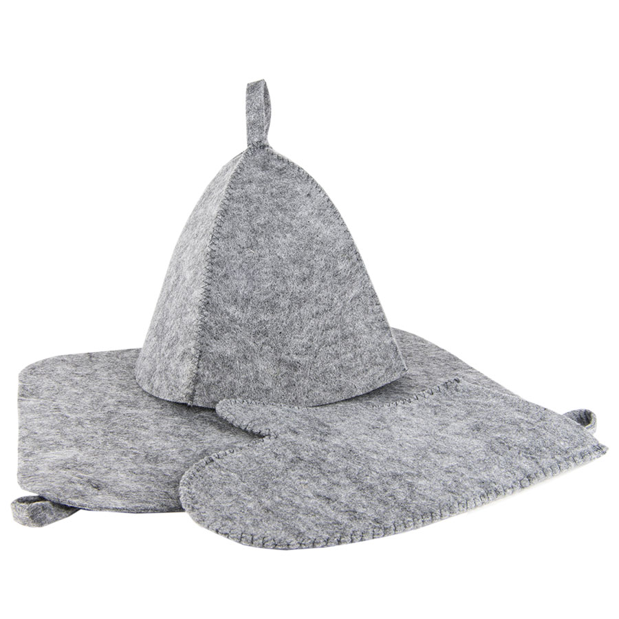 Расширенный классический набор для сауны из лавсана – коврик, шапочка и рукавица из войлока. Коврик убережет от ожогов в сауне, шапочка предотвратит тепловой удар и не позволит высокой температуре и влажности испортить волосы, а рукавица не позволит вам обжечься паром.Материал: Лавсан
