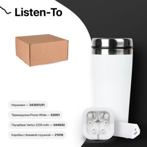 Набор подарочный LISTEN-TO: термокружка, зарядное устройство, наушники, коробка, стружка, белый 6219 ₸