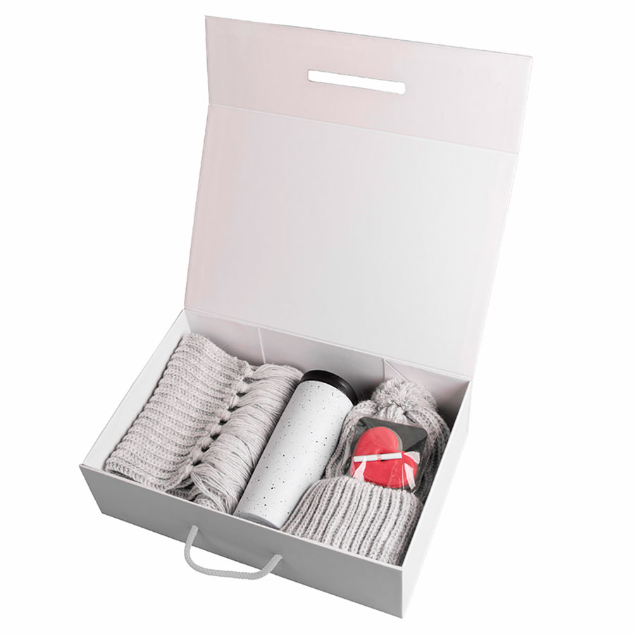 Арт. 21065 01 Коробка складная подарочная, 37x25x10cm, кашированный картон, белый. Арт. 24110 94 Вязаный комплект GoSnow с фурнитурой. Арт. 29002 01 Термокружка вакуумная SPACE, 450 мл. Арт. 34106 Печенье шоколадное Сердце с Предсказаниями.