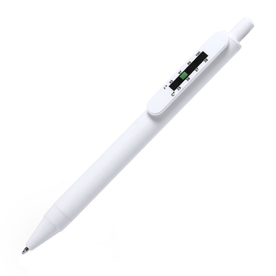 Шариковая ручка с антибактериальным покрытием, с термометром, встроенным в клип. Кнопочный механизм. Монохромный дизайн, специально разработанный для тампонной печати. Синие чернила.Представлена в индивидуальной дизайнерской сумке.