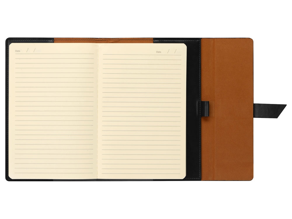 Бизнес-блокнот формата А5 в твердой обложке из искусственной кожи станет отличным подарком для любого клиента. Блокнот состоит из обложки с клапаном и сменного блока с линованными страницами. Внутри обложки есть петля для ручки в тон (ручка в комплект не входит).