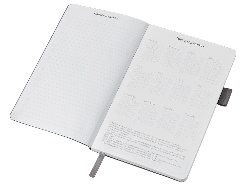 Необычный для блокнота вводный блок включает трекер привычек, списки книг и фильмов, а также 4 страницы для раскрашивания с картинками и мандалами.