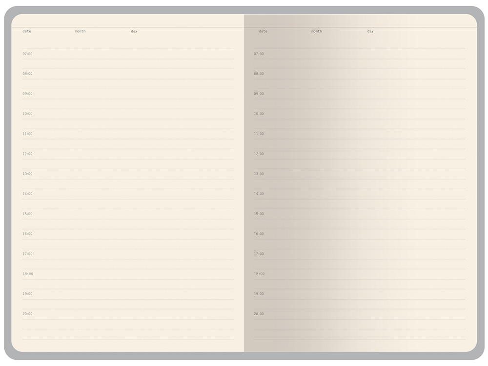 Бумажный блок, закрепленный книжным переплетом, выполнен из бежевой офсетной бумаги плотностью 70 г/ кв м. Внутри блока есть страница для персональных данных, справочная информация на 13 страницах. Блок для записей имеет линовку с указанием временных интервалов в один час.
