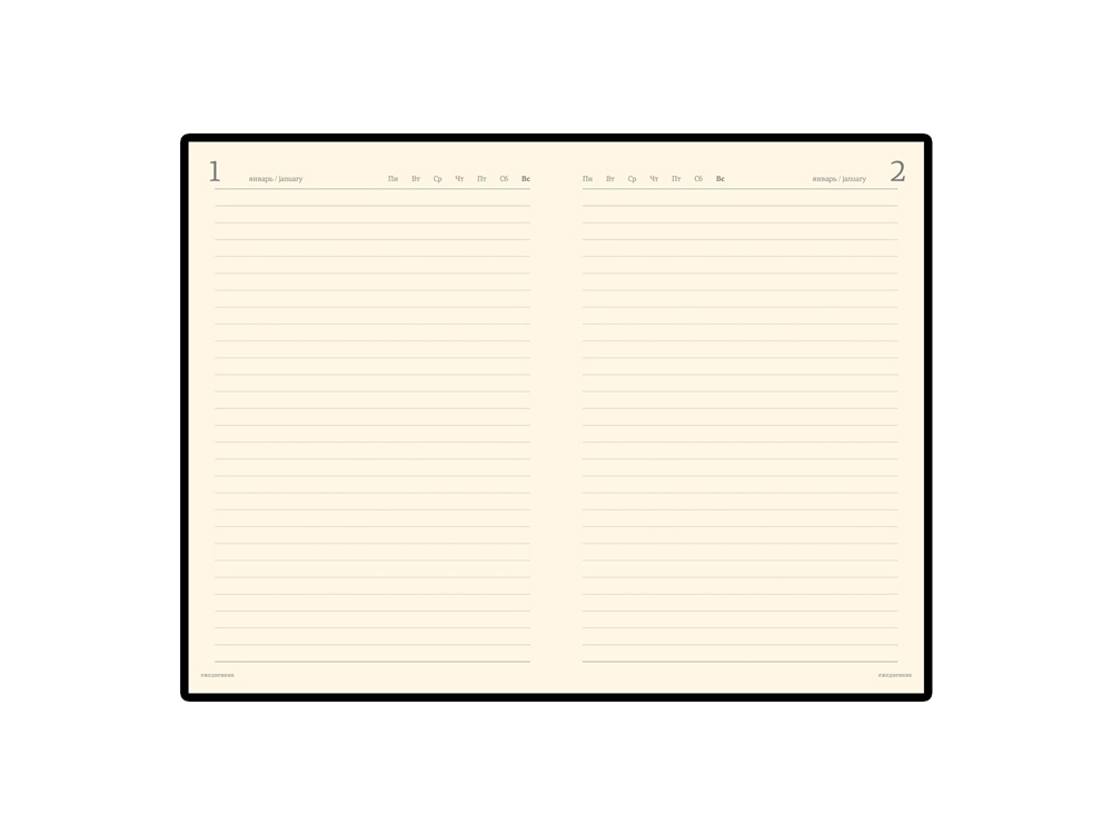 Ежедневник формата А5 выпускается размером 143*216 мм. Полудатированный сменный блок включает 416 страниц бежевого цвета.