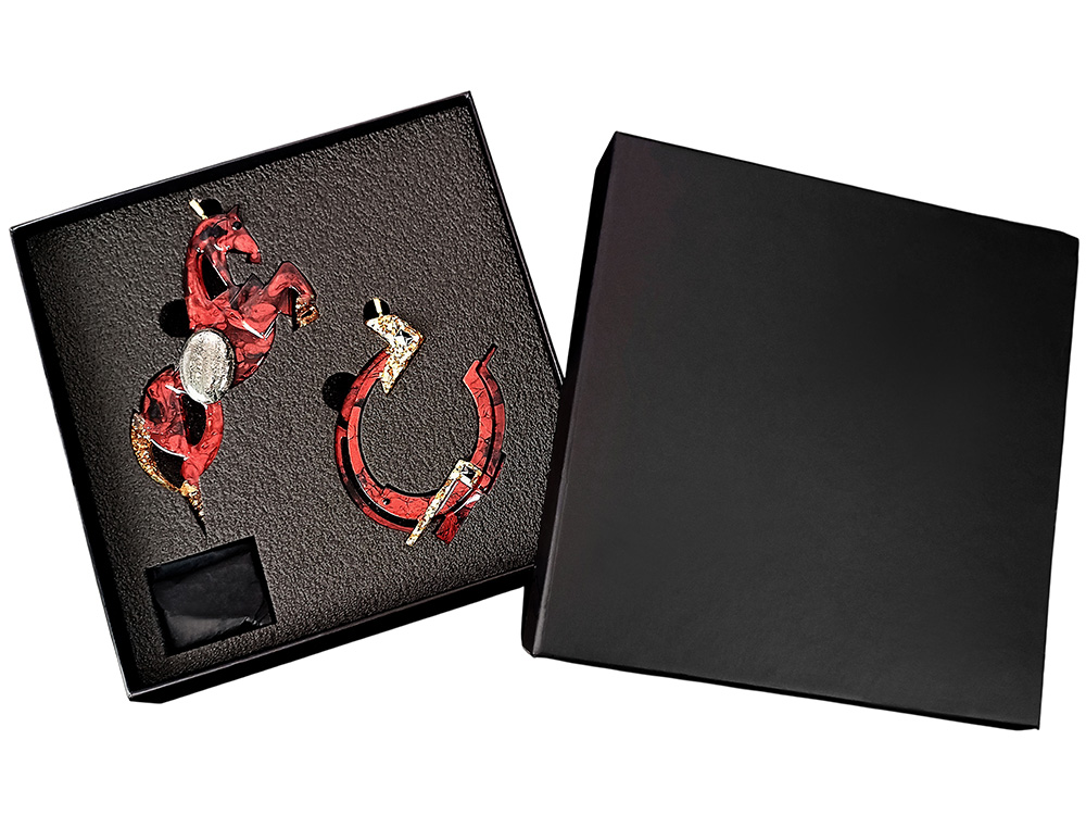 Изысканный дуэт талисманов, наполненных символизмом и энергией в духе Василия Кандинского. В набор входят две уникальные фигурки: лошадь и подкова, созданные в оттенке «Гранатовый шёлк» — насыщенном, благородном бордо с лёгким шелковистым отблеском, напоминающем вечернее праздничное платье.
