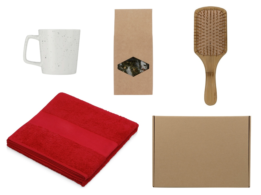 полотенце — 100% хлопок, расческа — бамбук, чай — картонная упаковка, кружка — костяной фарфор, коробка — картон