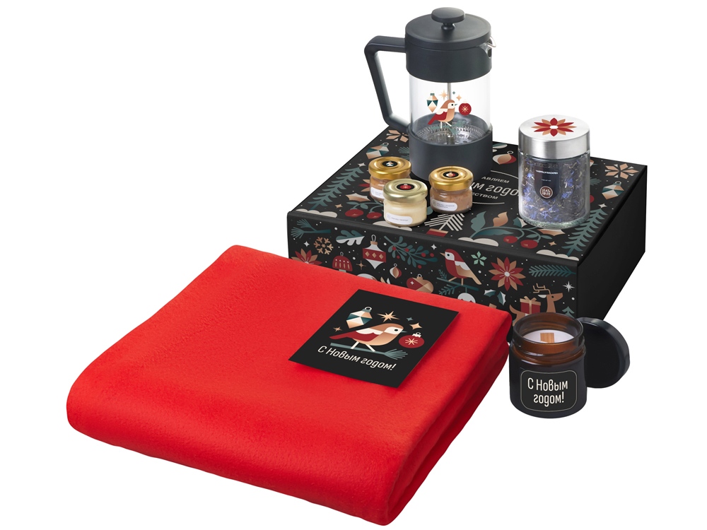 | Материал товара | плед — флис 100% полиэстер; френч-пресс — боросиликатное стекло, нержавеющая сталь, пластик; открытка — бумага; мешок — нетканый материал (спанбонд) |