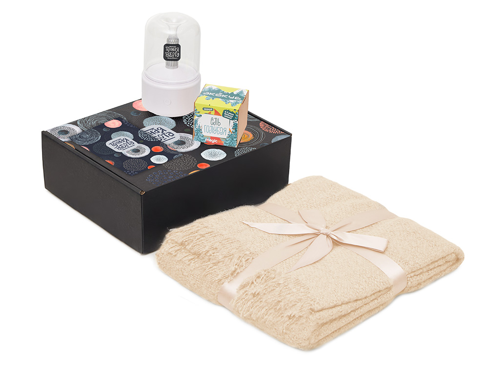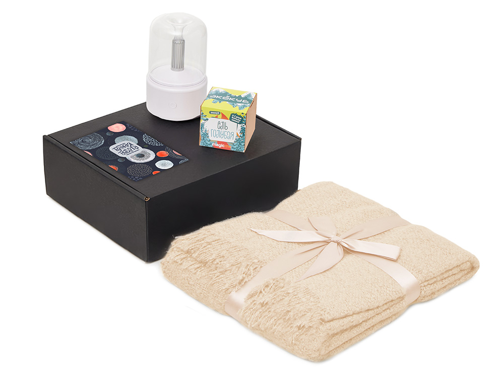 плед — 100% акрил, увлажнитель-аромадиффузор — АБС палстик, поликарбонат, набор для выращивания — дерево, мешок — нетканый материал (спанбонд), коробка — картон