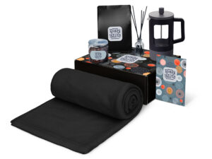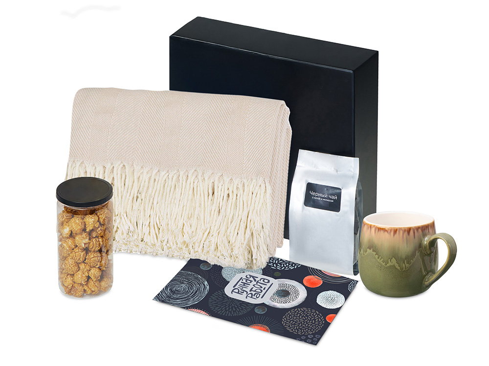 плед — 100% хлопок, кружка — костяной фарфор с покрытием soft-touch,чай — пластик, попкорн — пластик, металл, мешок — нетканый материал (спандонд), коробка — картон