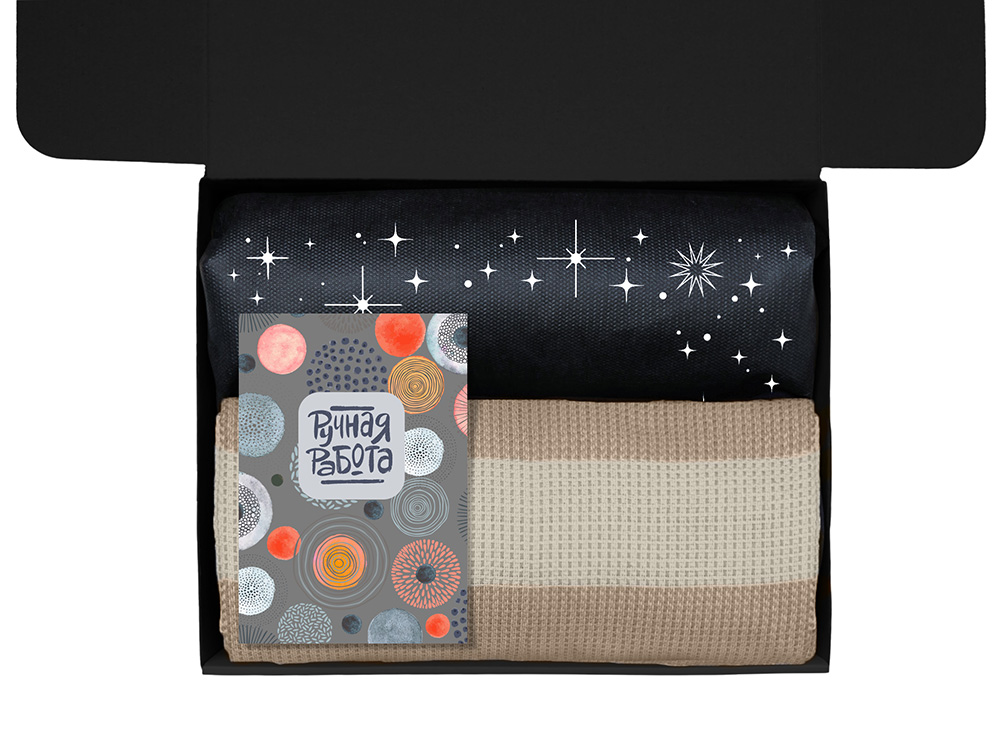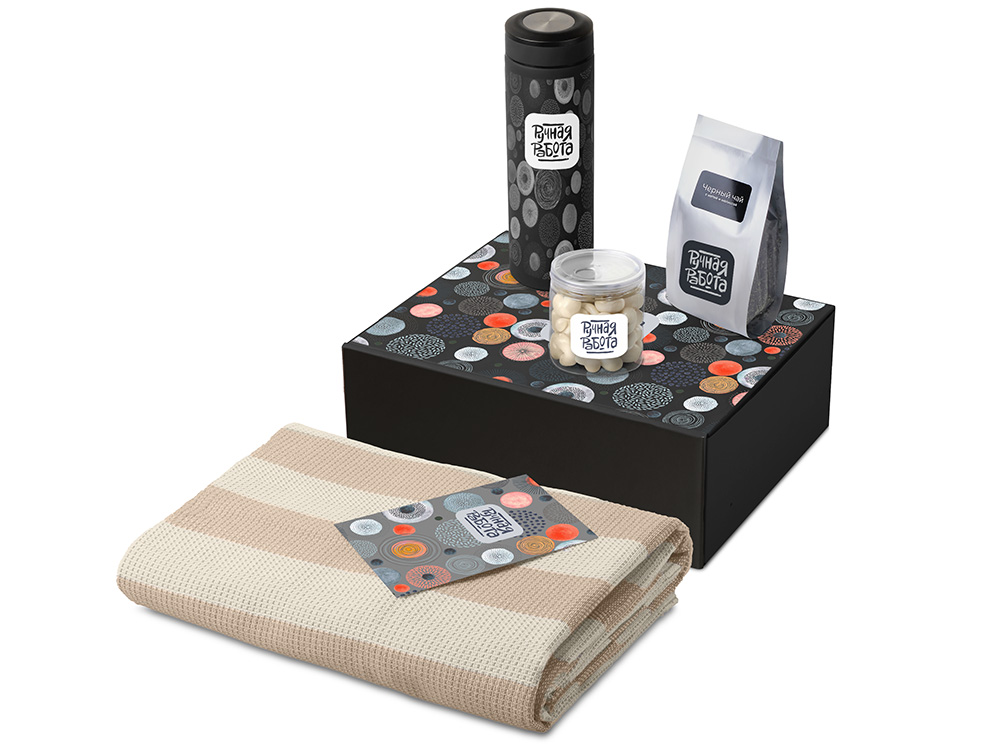 | Материал товара | плед — 100% хлопок, термос — нержаваеющая сталь с покрытием soft-touch, чай — пластик, мешок — нетканый материал (спанбонд), коробка — картон |
