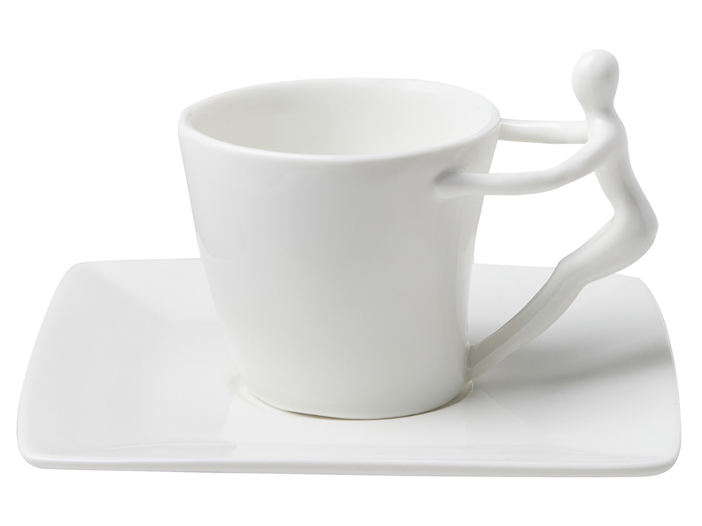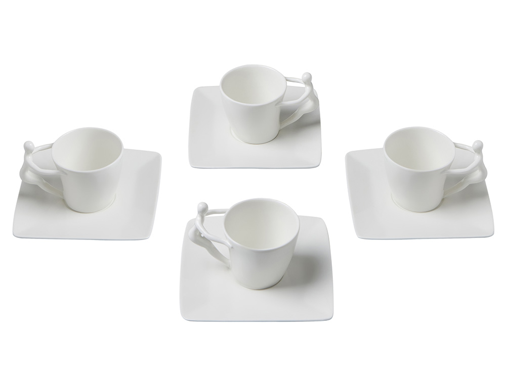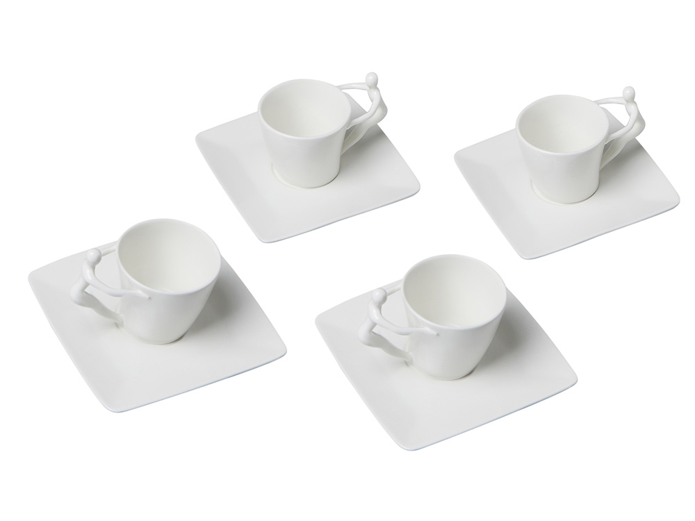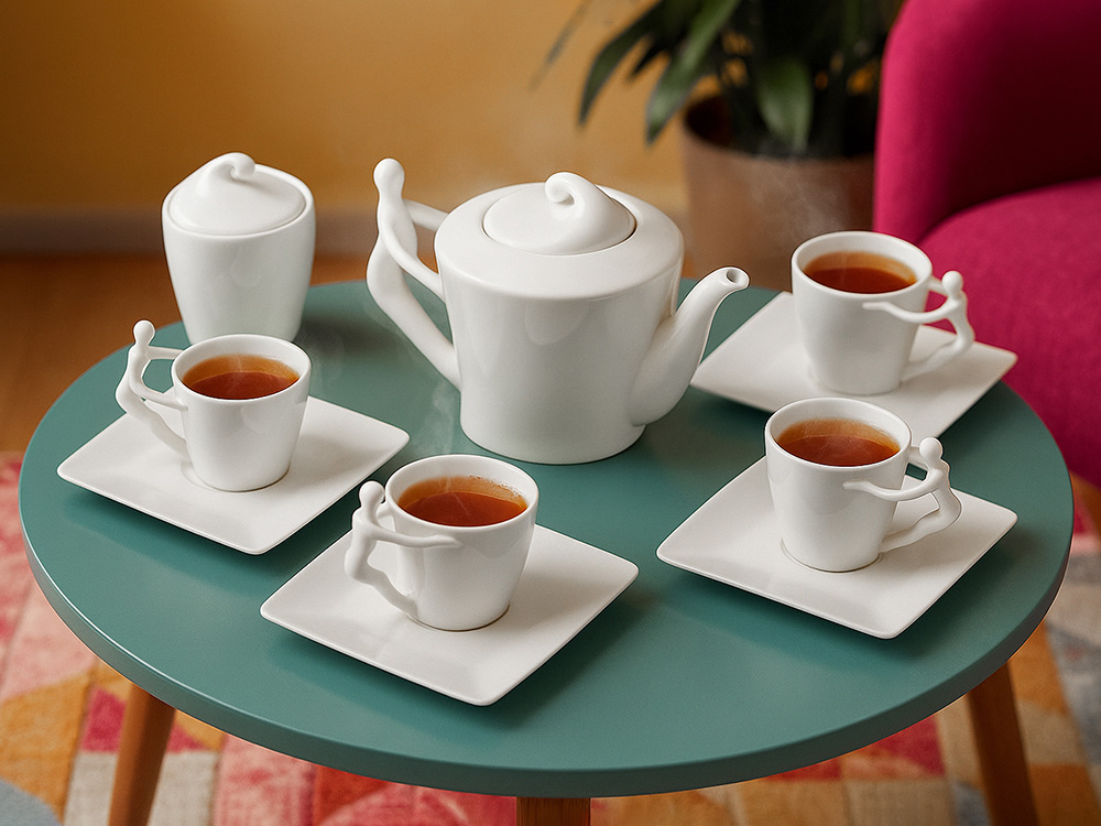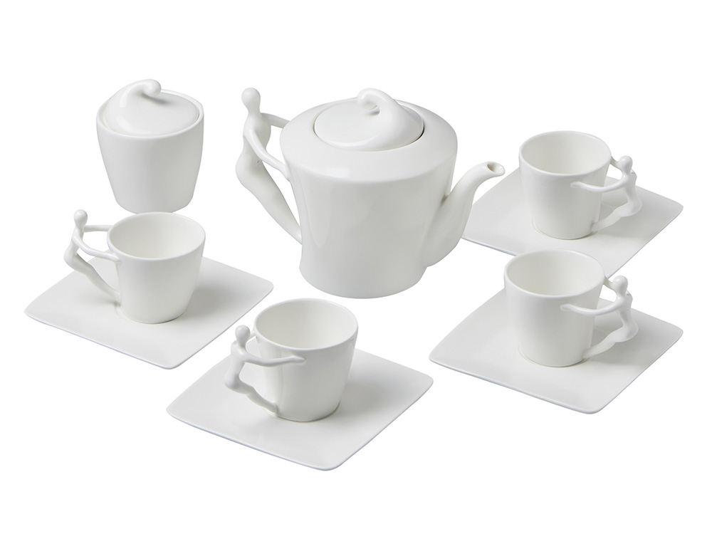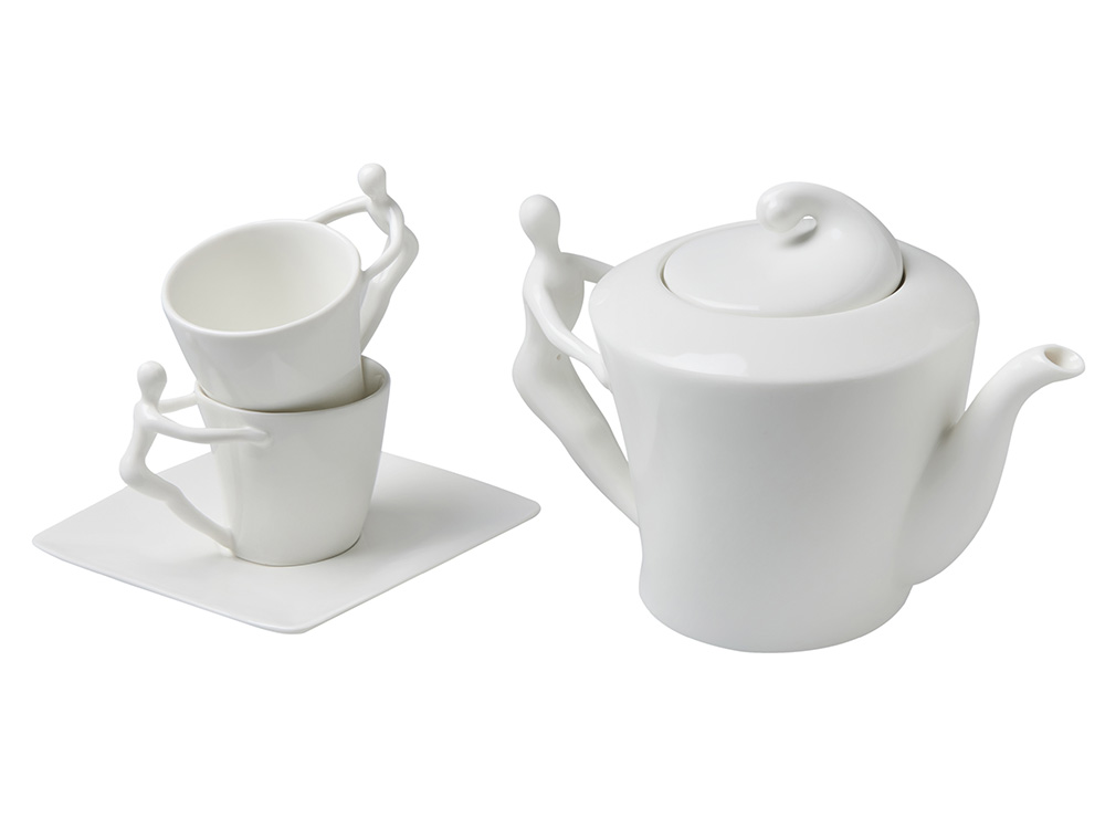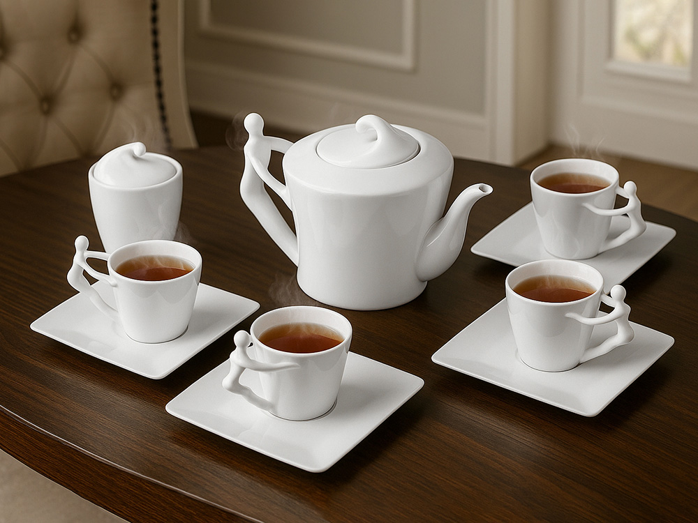 Ручки чашек и чайника выполнены в виде стилизованной фигуры человека. Это придает сервизу особый характер и глубину, превращая процесс чаепития в диалог с искусством.
