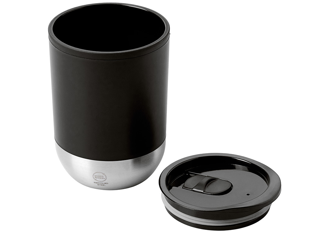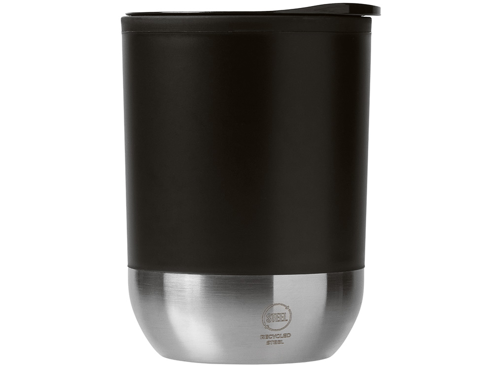 Термокружка с двойными стенками из переработанного полипропилена и дном из нержавеющей стали 304. В комплекте крышка-слайдер. Объём: 290 мл. Поставляется в экологичной коробке.